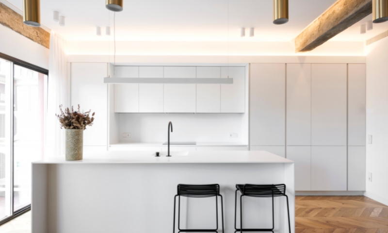 La solución más eficiente es la instalación de tiras LED continuas bajo los muebles superiores, garantizando una iluminación homogénea.
