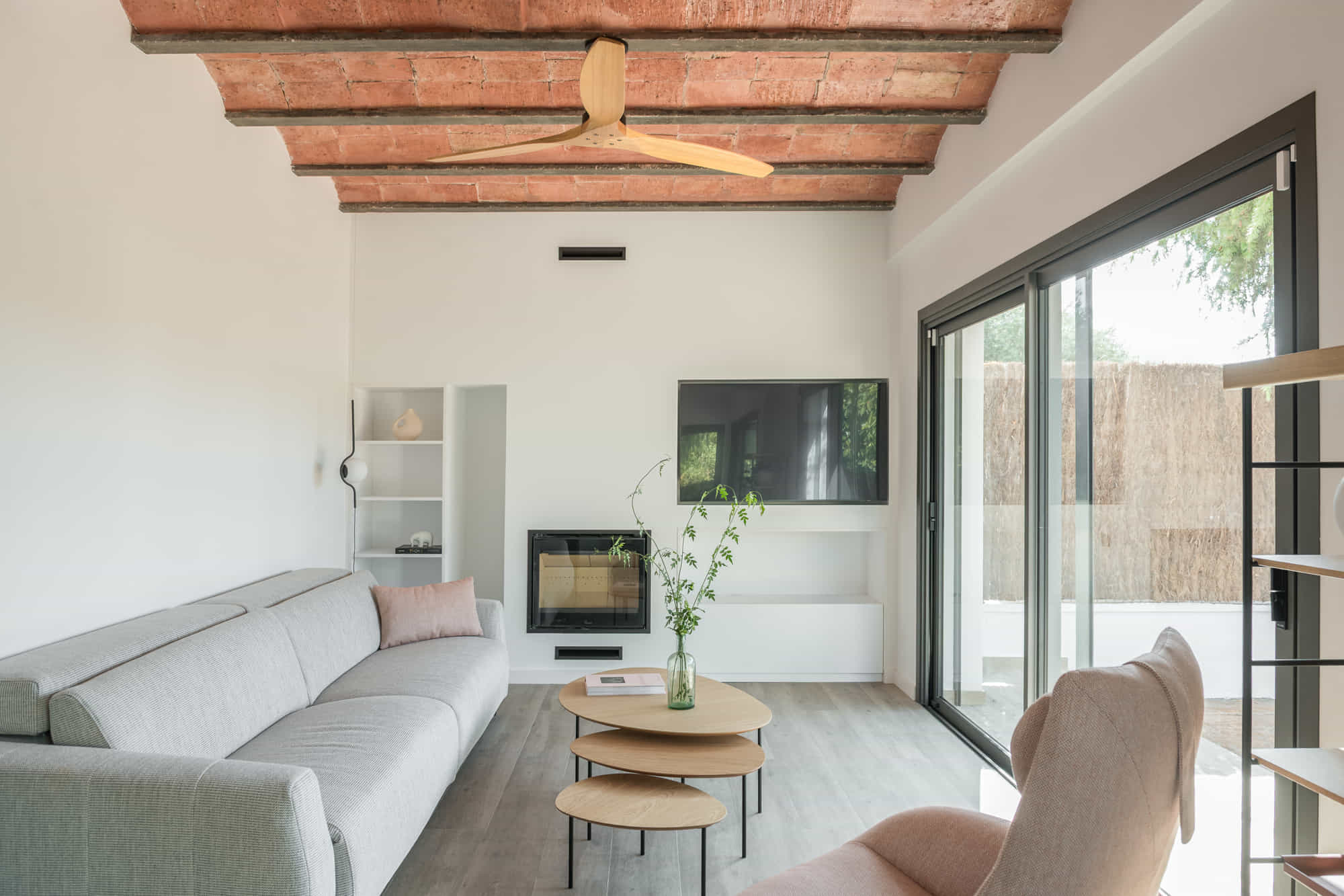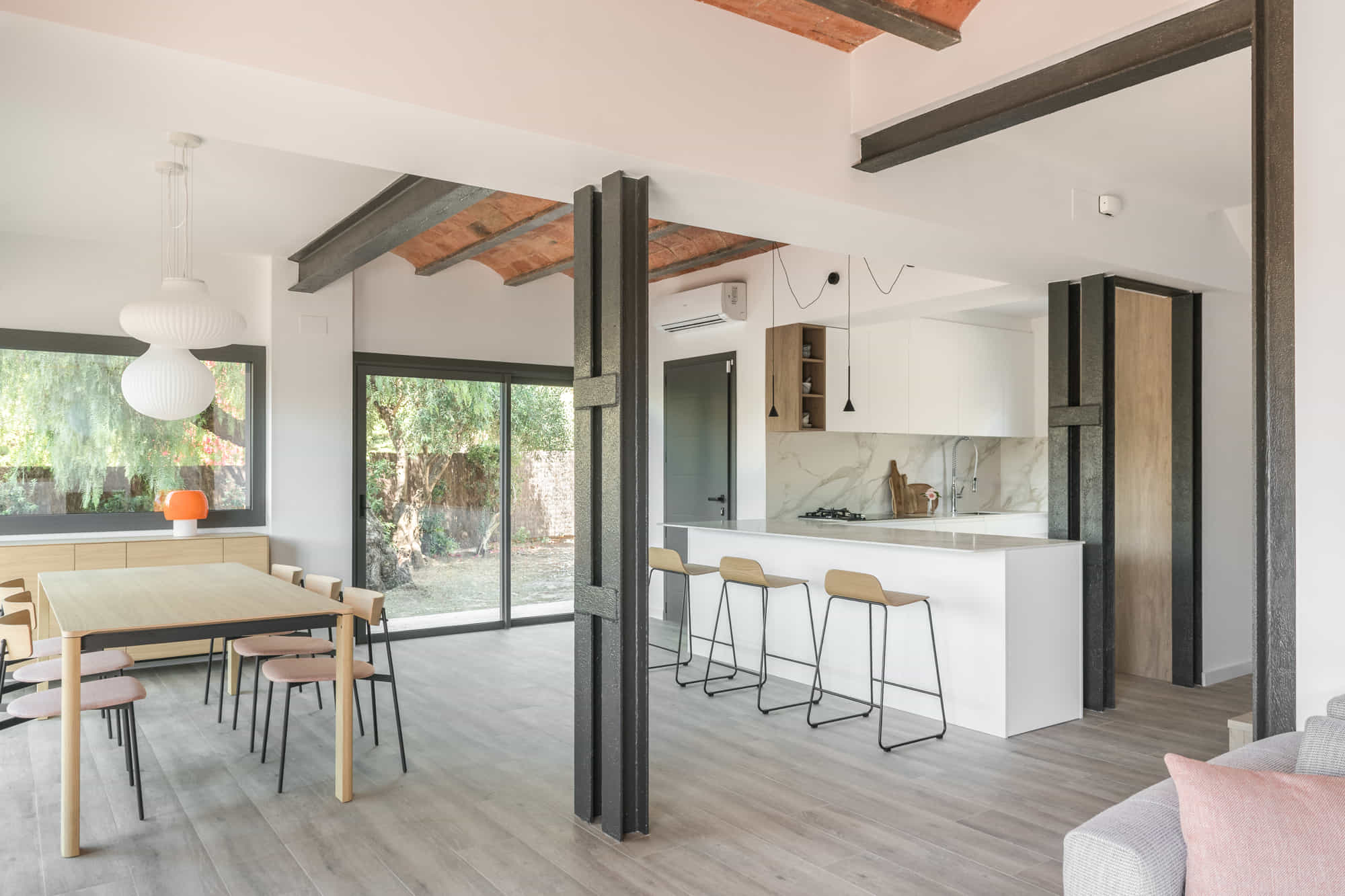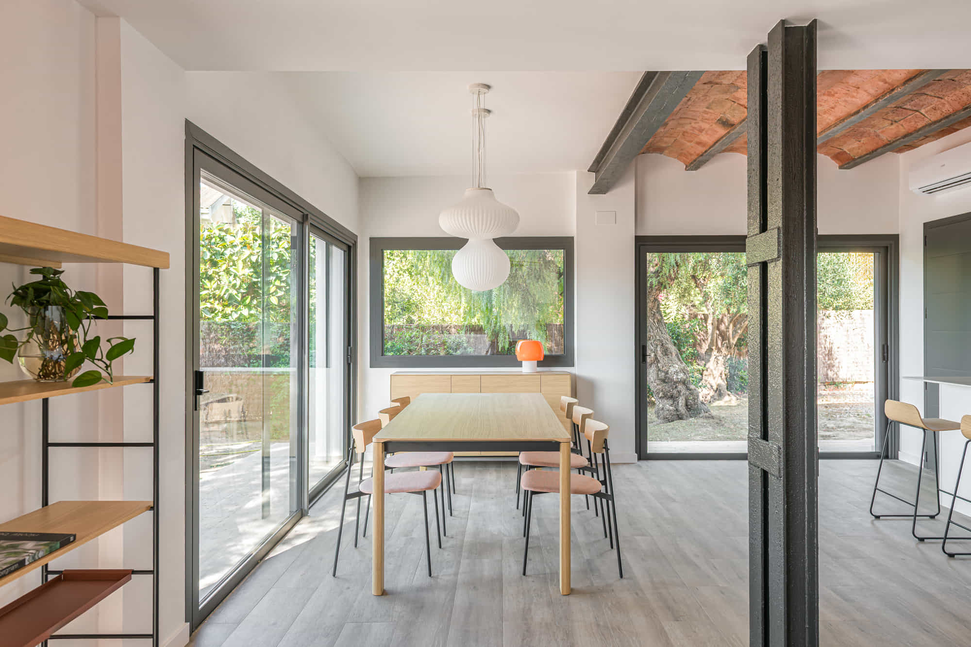 El principal desafío fue abrir la planta baja, eliminando paredes de carga y utilizando estructura metálica vista como elemento visual clave. Esta intervención, además de garantizar la estabilidad, conecta el interior con el jardín a través de grandes ventanales, maximizando la entrada de luz natural. La eficiencia energética fue otro pilar del proyecto, con soluciones como aislamiento en fachada, aerotermia y suelo radiante. En este sentido, el ventilador de techo Alo ofrece un extra de comodidad y funcionalidad sin restar estética al espacio.