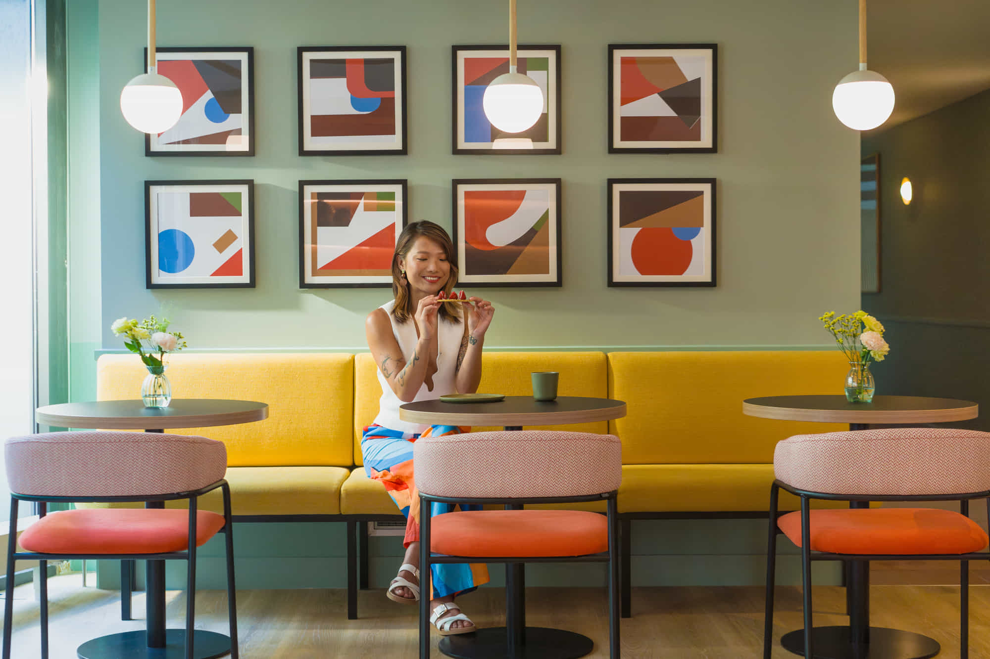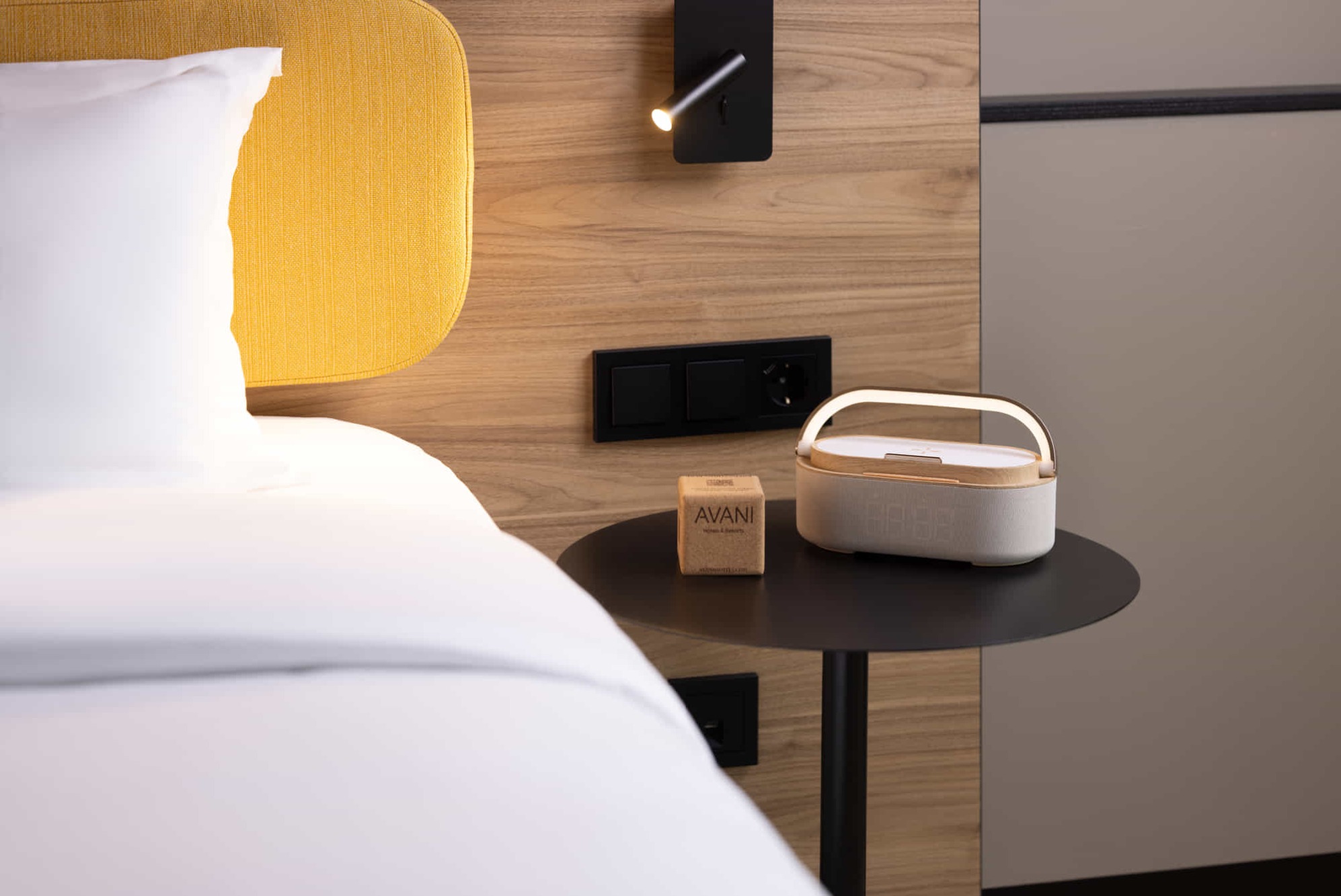 Las habitaciones del Avani Museum Quarter también se han trabajado con especial atención a la iluminación. Para la zona de lectura junto a la cama, se ha optado por el lector de pared Suau negro, también diseñado por Nahtrang. Su estética minimalista y funcional se integra con naturalidad en un entorno lleno de color, donde azules, verdes, corales y naranjas conviven en perfecta armonía. La practicidad del diseño, con interruptor integrado, facilita su uso diario y refuerza el confort de la estancia.