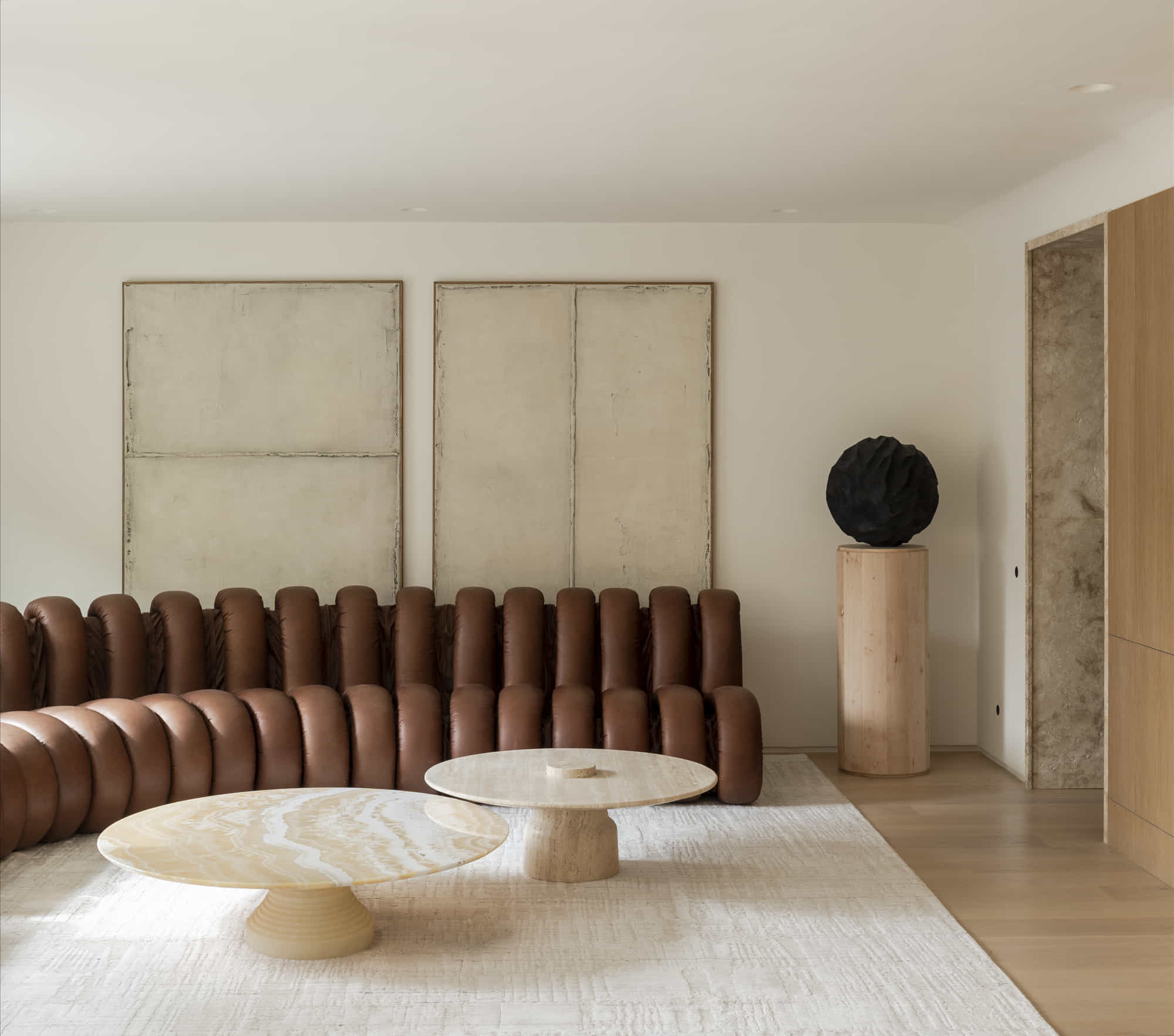 En continuidad, el salón combina un sofá modular tapizado en piel marrón de Studio Bañón con mesas de centro de mármol travertino y ónix egipcio, piezas que refuerzan el carácter atemporal de la vivienda. En este espacio, la iluminación se resolvió con los focos empotrables Fox de Faro Barcelona, una solución arquitectónica discreta que ofrece luz puntual sin interferir con la altura de los techos ni con la contemplación de los cuadros de Antonia Ferrer.