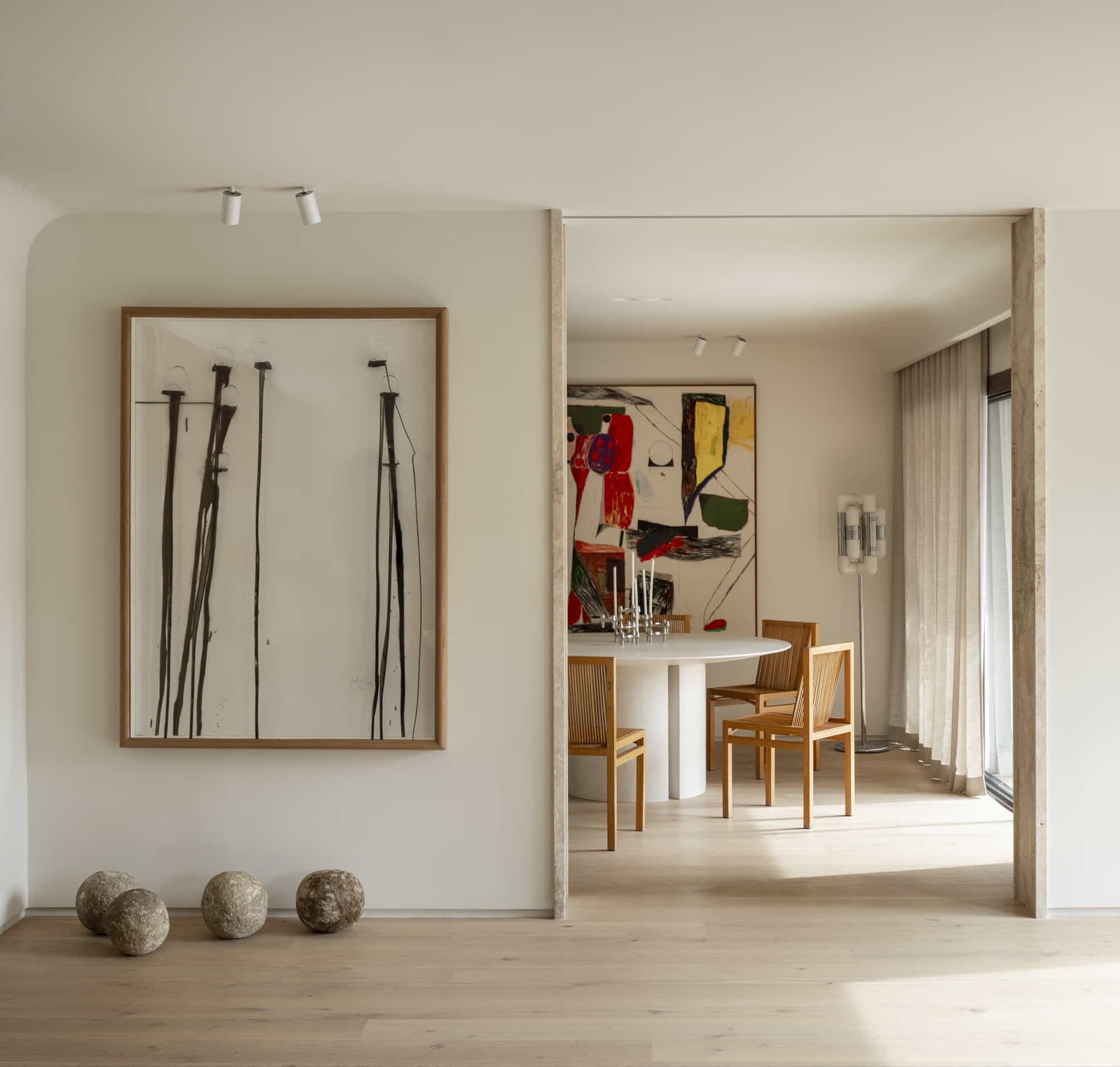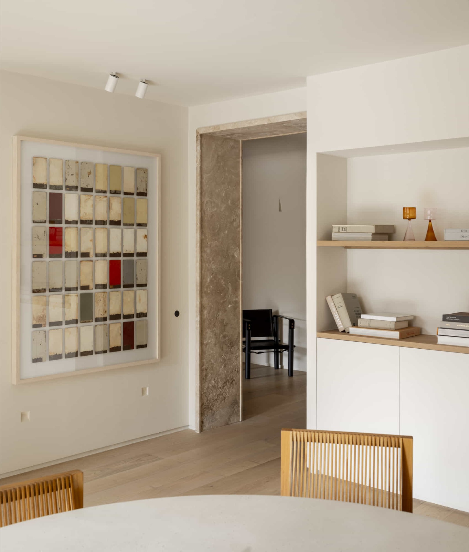 En el comedor, una mesa de microcemento diseñada por el propio estudio se acompaña de cinco sillas originales de los años 80 firmadas por Ruud Jan Kokke. Sobre la pared, una obra de gran formato introduce un toque de color. Para destacar estas piezas artísticas, que representan una constante del proyecto, se instalaron proyectores de techo de Faro Barcelona, en acabado blanco, que permiten dirigir la luz con precisión sin romper la estética minimalista del espacio.