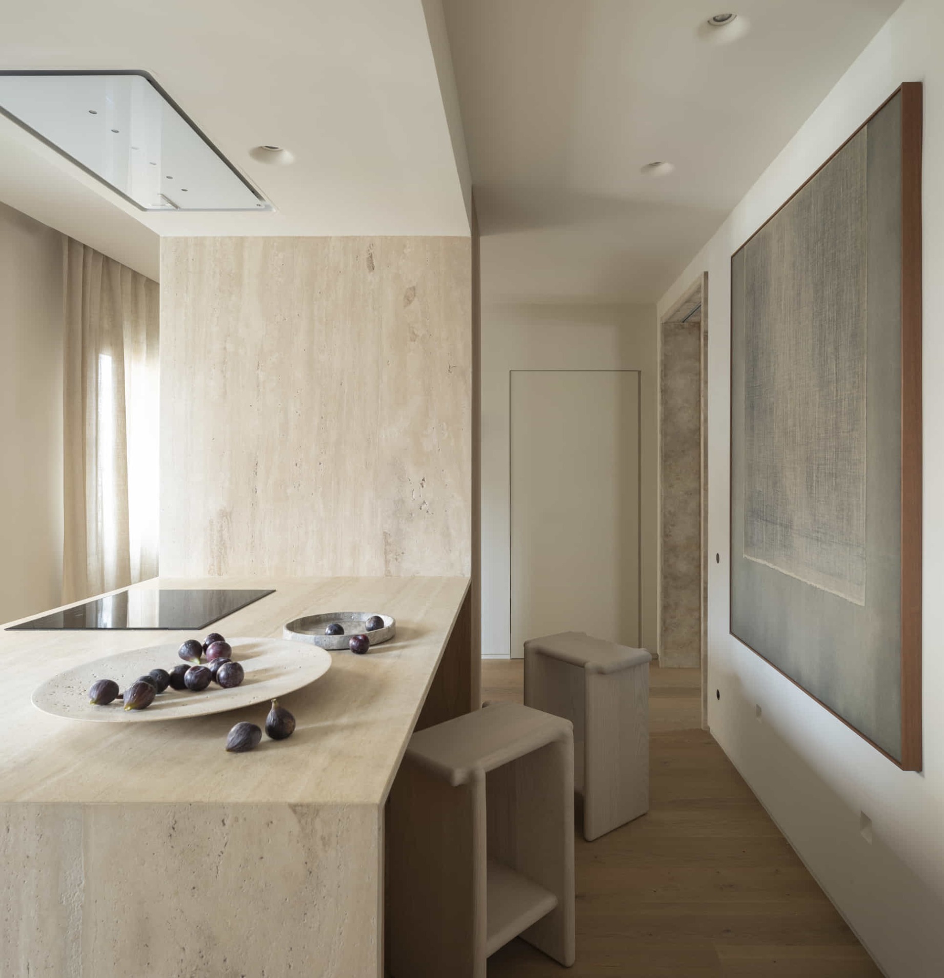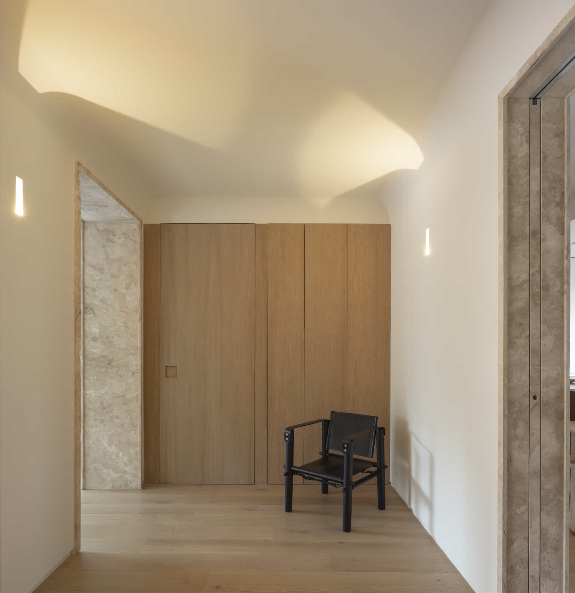 El objetivo principal fue abrir espacios y generar una gran zona social, eliminando recorridos innecesarios y potenciando la sensación de altura en los techos. Para ello, el estudio apostó por un lenguaje arquitectónico claro, donde la iluminación refuerza la percepción de amplitud, mientras las embocaduras en piedra natural marcan la jerarquía de cada estancia y materiales nobles como el roble natural y el travertino Olivillo actúan como hilo conductor.