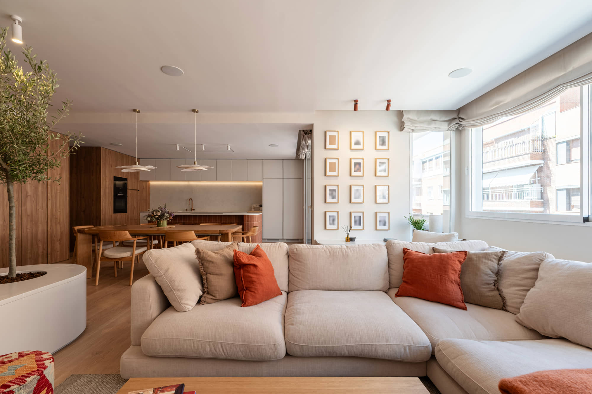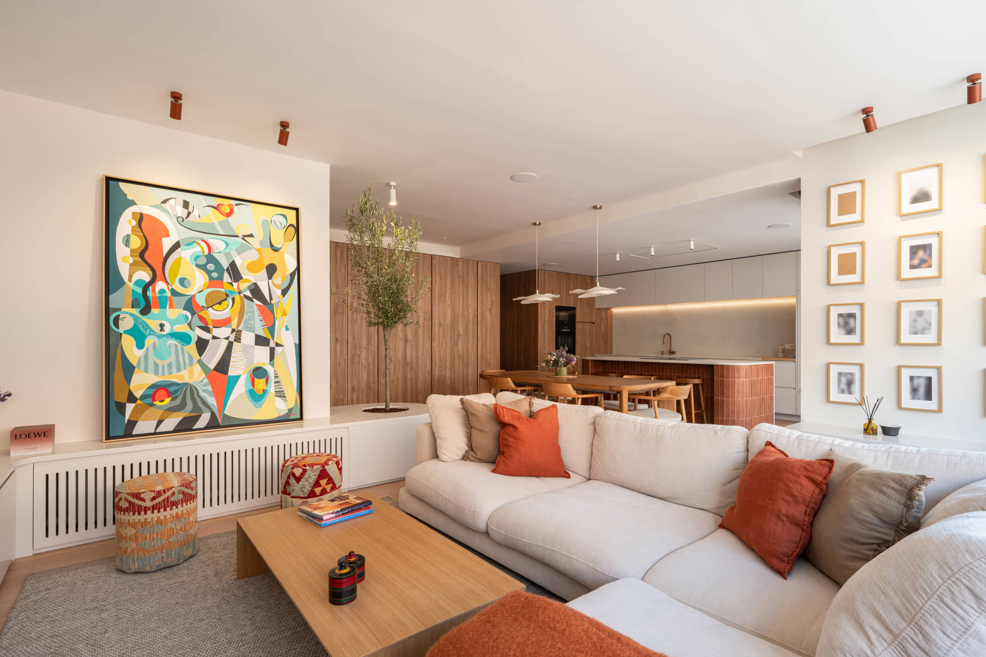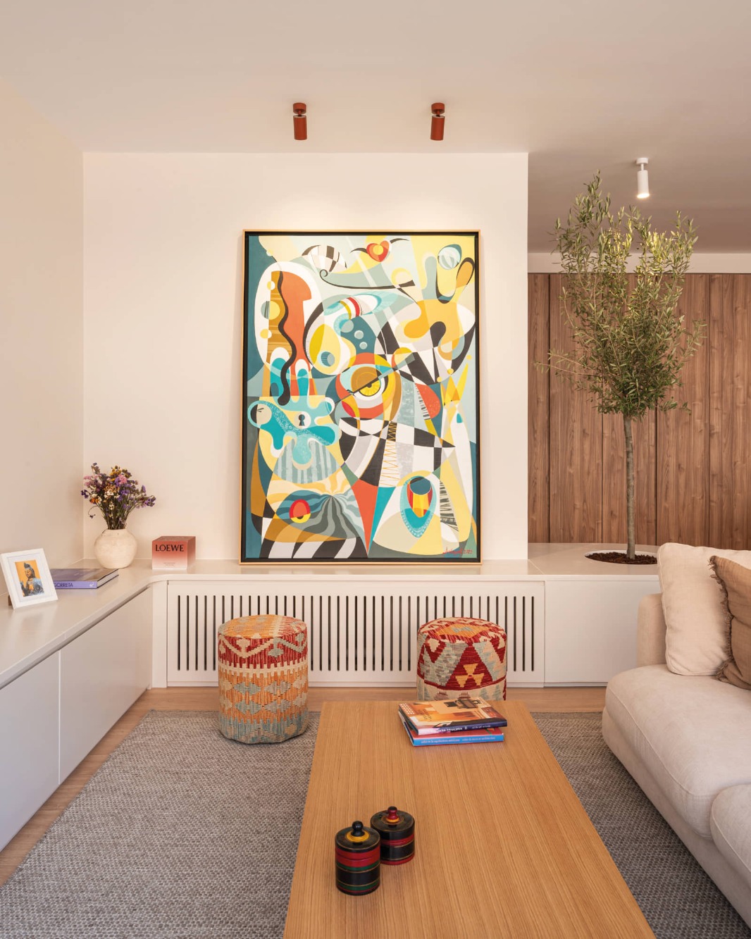 En el salón, una gran obra de arte domina la escena con su composición abstracta, llena de colores saturados que dialogan con la luz puntual de los proyectores Stan. La pieza funciona casi como una ventana emocional, un contrapunto expresivo que contrasta con la sobriedad cromática del resto del espacio. Junto a ella, un olivo joven se erige como un simbólico homenaje a lo español, reforzando ese diálogo entre lo orgánico y lo llamativo. Bajo el cuadro, lo mexicano se hace presente con dos taburetes tapizados en tejidos que evocan patrones tradicionales, combinando motivos geométricos con una paleta de tonos cálidos.
