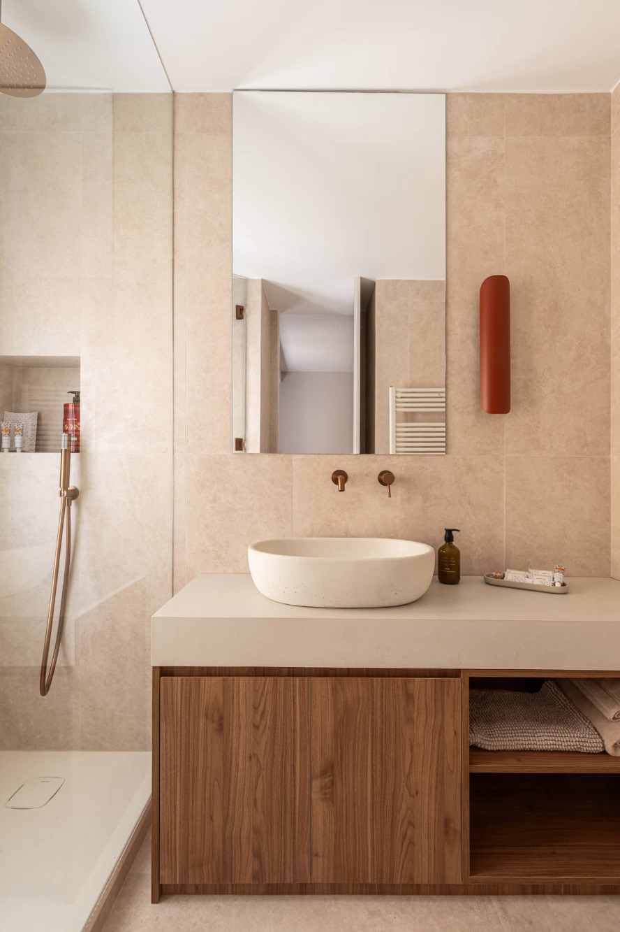 El pasillo y el aseo mantienen la coherencia estética gracias a apliques estratégicamente colocados. En el baño, junto al espejo, se ha instalado un aplique de pared Novo en acabado terracota de forma estratégica. La iluminación de baños puede ser complicada, ya que es fácil que se creen sombras donde no queremos: sin embargo, este tipo de iluminación indirecta lateral evita deslumbramientos al reflejarse en el espejo y deja la cara del usuario suavemente iluminada.